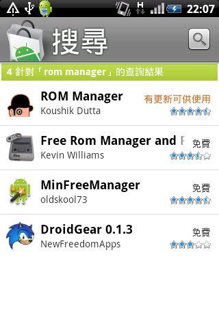 這款軟體可以在Android Market中搜尋"ROM Manager"